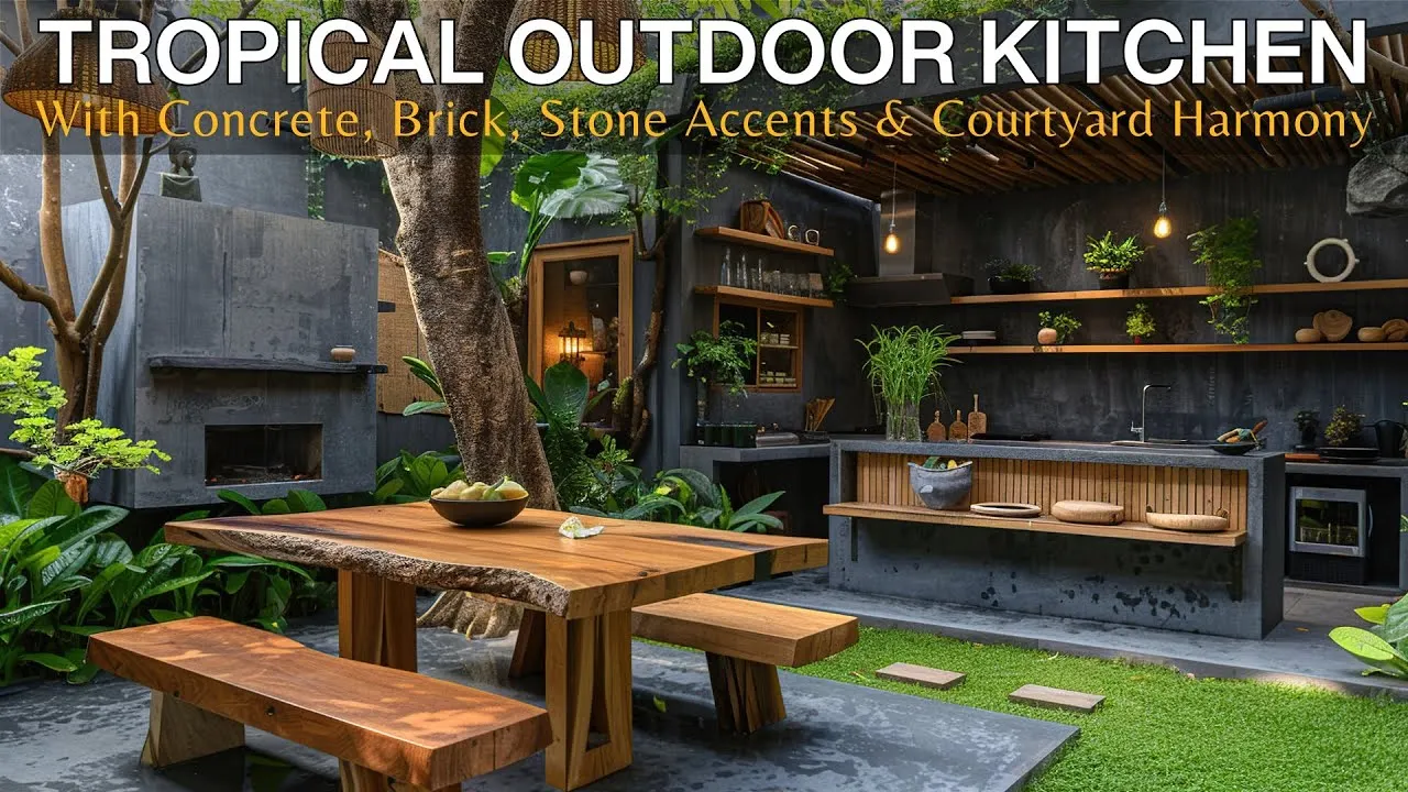 A Modern Tropical Outdoor Kitchen Dining Area with Brick Concrete, Stone Accents & Courtyard Harmony