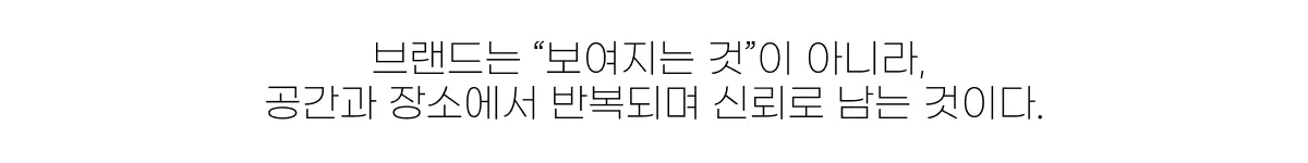 따라서 공간과 장소 브랜딩의 핵심은 ‘무엇을 보여줄 것인가’가 아니라, ‘어떤 경험이 반복될 때 의미가 남는가’를 설계하는 데 있다. 공간은 만들 수 있지만, 장소는 만들어진 공간이 일정한 방식으로 사용되고 유지될 때 비로소 형성된다. 브랜드의 기준이 공간에 남는다는 것은 결국, 그 반복 가능한 조건이 공간 안에 내장되어 있다는 뜻이다.