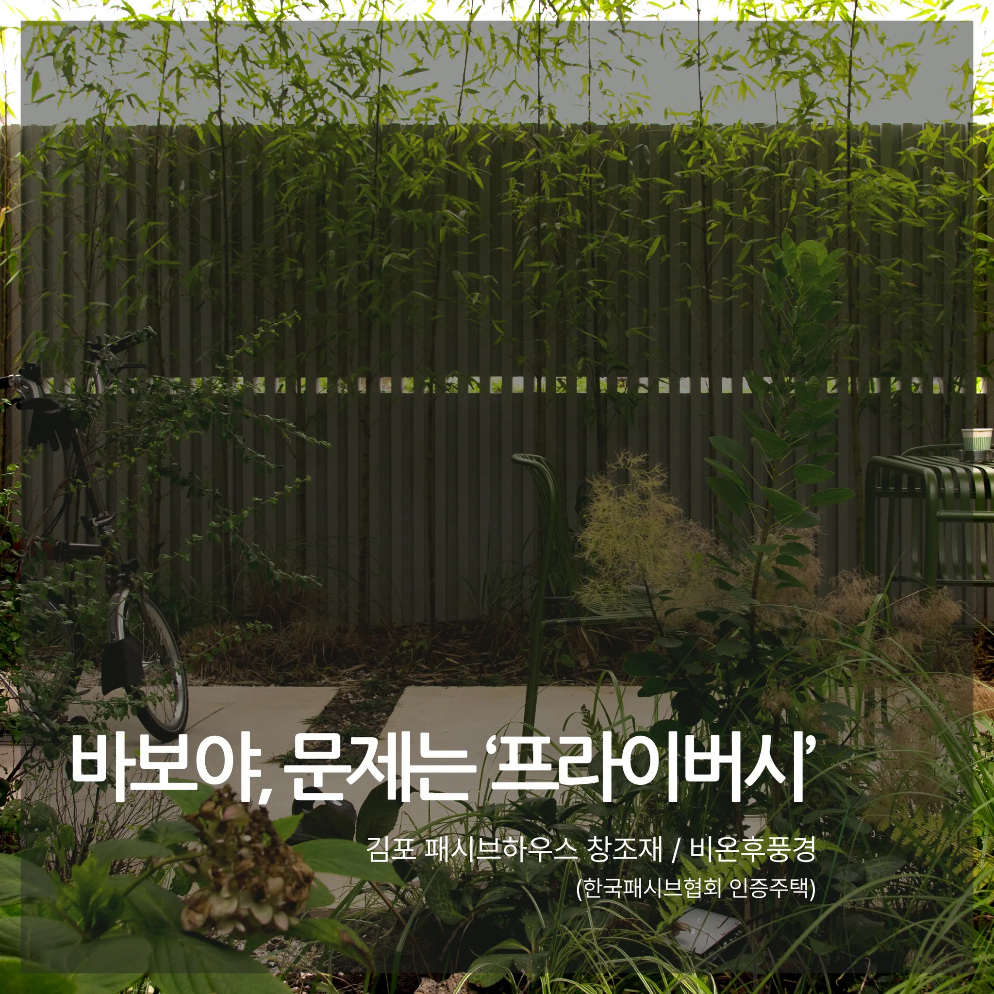 이러한 요인들로 인해 도심 주택 마당이든, 전원주택의 마당이든 마당의 프라이버시 확보가 어려운 경우가 대부분이며, 이로 인해 쓸모없는 마당, 사용성이 현저하게 떨어지는 마당이 될 수밖에 없는 것이다.
