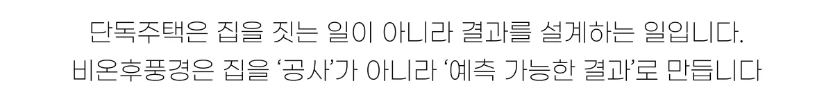 비온후풍경은 단독주택을 공사가 아니라 예측 가능한 결과로 만들려는 회사입니다. 그리고 그 핵심은 디자인 이전에 시스템입니다.